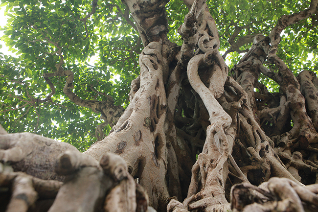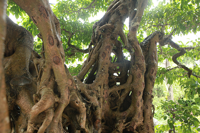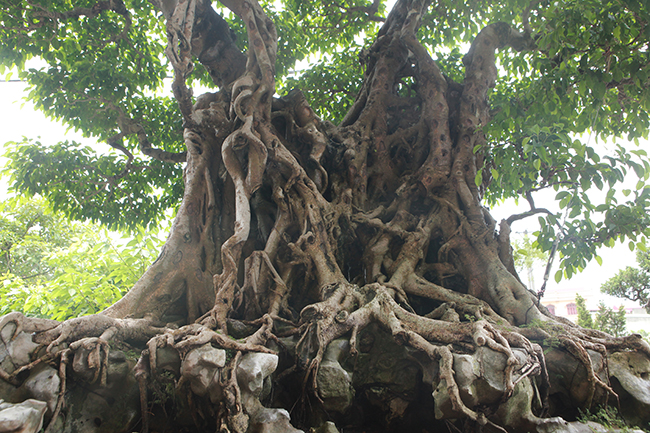 Cây sanh như một bức tranh cổ vì cây nguyên bản, từ rễ đến thân một màu đồng. “Nếu không phải cây nguyên bản thì thân cây có chỗ đỏ, chỗ xanh (cây ghép)”, ông Lân giải thích.
