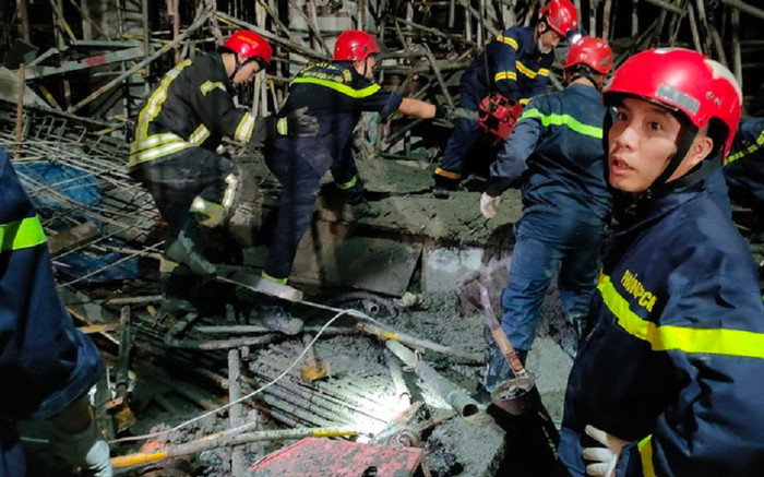 Theo Dân Việt, xác định được đây là sự cố sập đổ giàn giáo trong quá trình đổ bê tông sàn, có 2 người tử vong bị vùi lấp, lực lượng cảnh sát đã triển khai đội hình, sử dụng các máy cắt sắt, các thiết bị banh cắt thuỷ lực để tiến hành cắt các cấu kiện bị vùi lấp và đào bới để đưa nạn nhân ra ngoài.