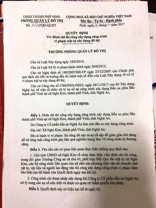 Chiều 29/11, Phòng Quản lý đô thị TP Vinh đã có quyết định số 1134/QĐ-QLĐT ngày 26/11/2017 đình chỉ thi công xây dựng công trình vi phạm trật tự xây dựng đô thị.