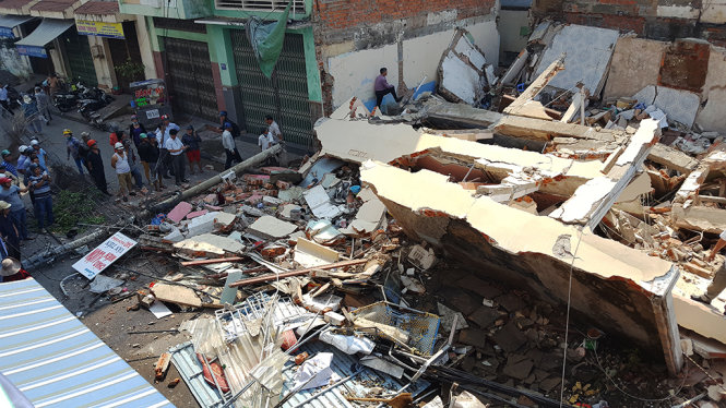 Những người gần hiện trường cho biết, khi công nhân đang đào móng xây nhà 298 đường Trần Hưng Đạo thì ngôi nhà 2 tầng ở số 296 kế bên đổ sập xuống.