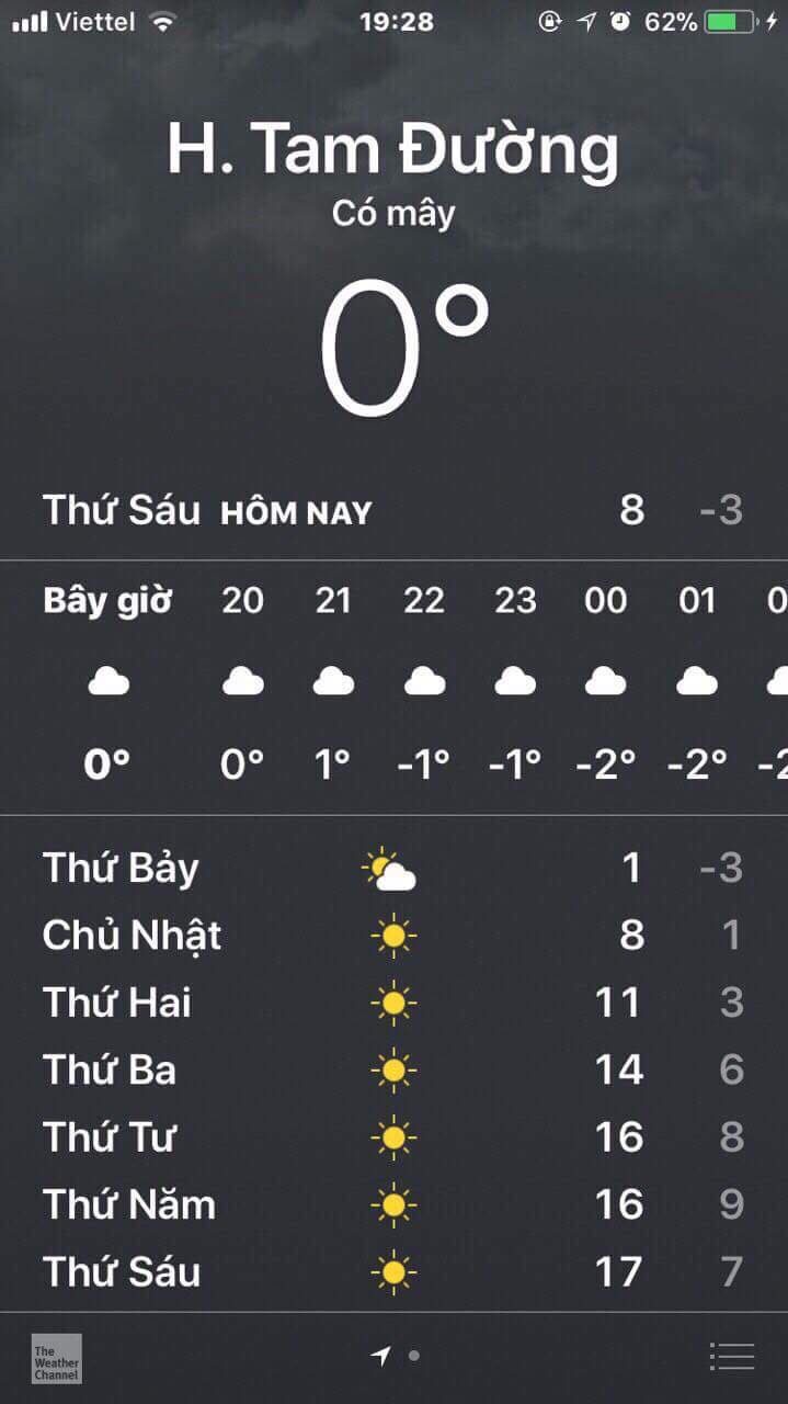 Trong khi đó ở trung tâm thị trấn Sa Pa (cao 1.570 m) nhiệt độ đang là 8 độ C. Trung bình lên cao 100 m, nền nhiệt sẽ giảm 0,6 độ C. Trước đó vào cuối tháng 10/2017, SaPa có tuyết rơi với mật độ dày nền nhiệt luôn ở mức âm độ C.