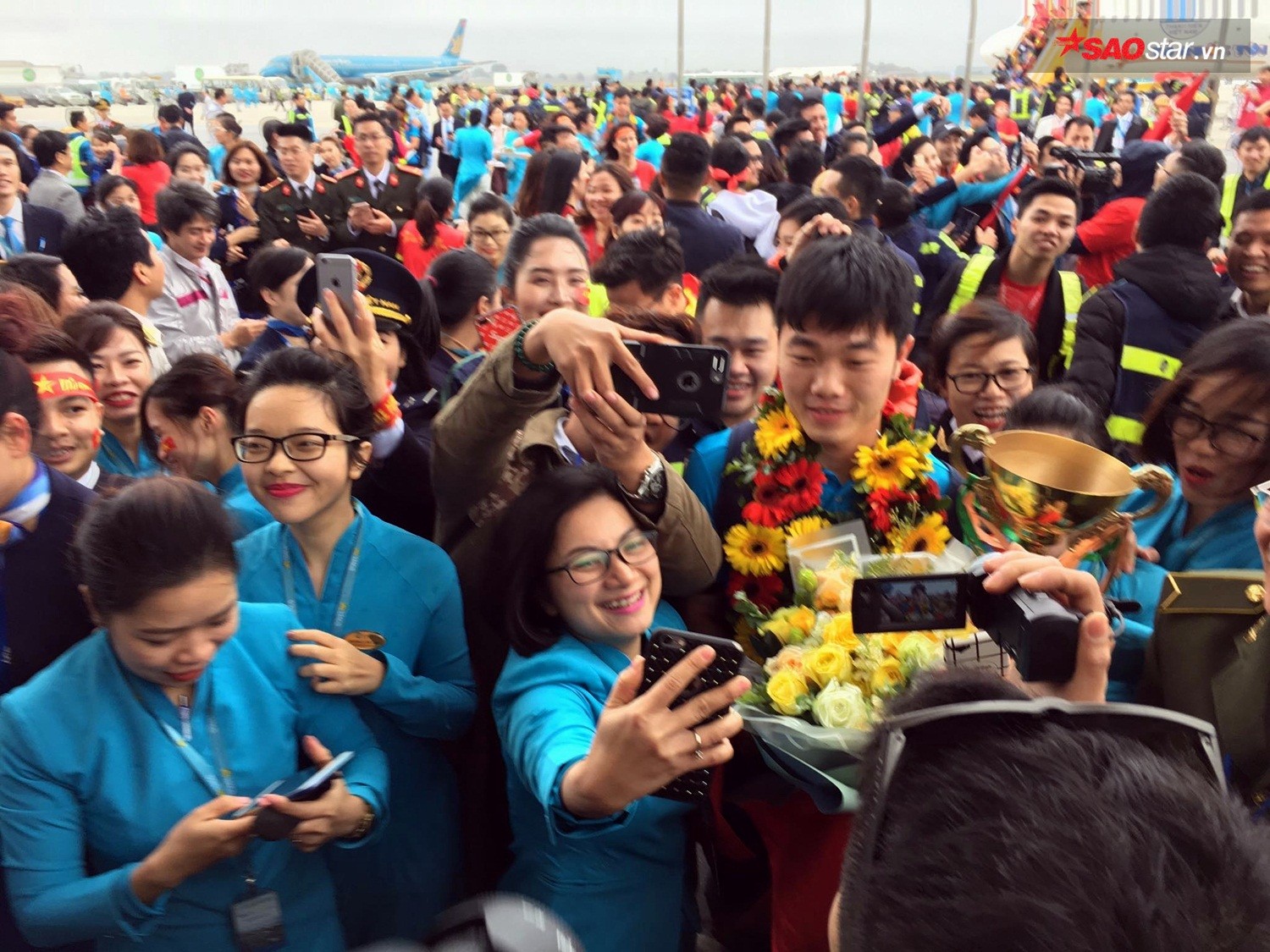 Các cầu thủ được trao tặng hoa ngay khi bước xuống sân bay.