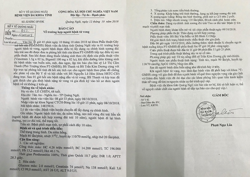 Ngày 12/10, Bệnh viện Đa khoa tỉnh Quảng Ngãi đã có báo cáo về trường hợp một bệnh nhân tử vong chưa rõ nguyên nhân sau khi điều trị lấy dụng cụ chỉnh hình xương đùi bên trái tại bệnh viện này.