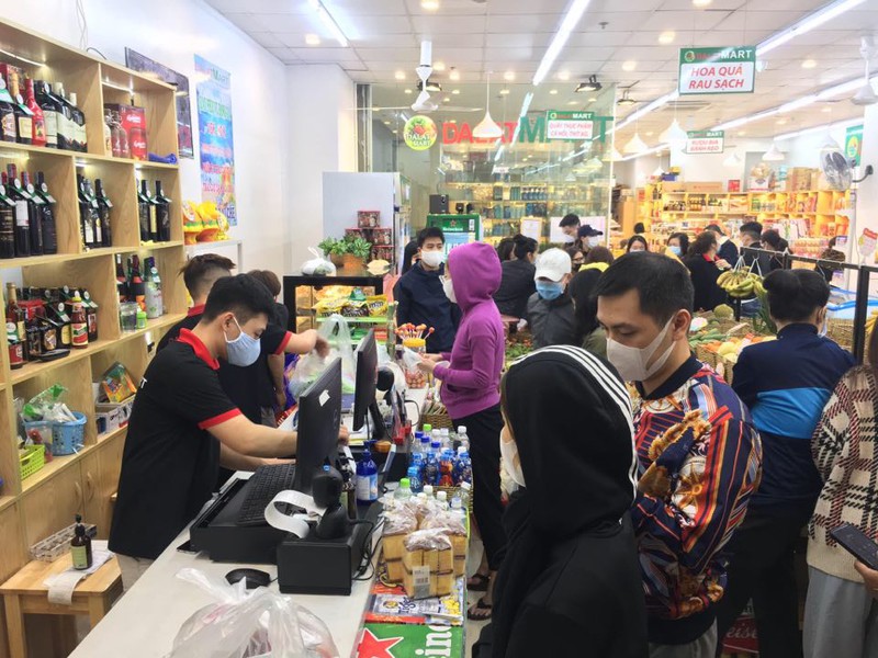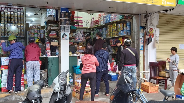 Một cửa hàng bán lẻ trên phố Lò Đức, Hà Nội cũng đông nghịt khách. Người dân ồ ạt gom mua mì tôm, sữa tươi về tích trữ. Ảnh Dân Trí