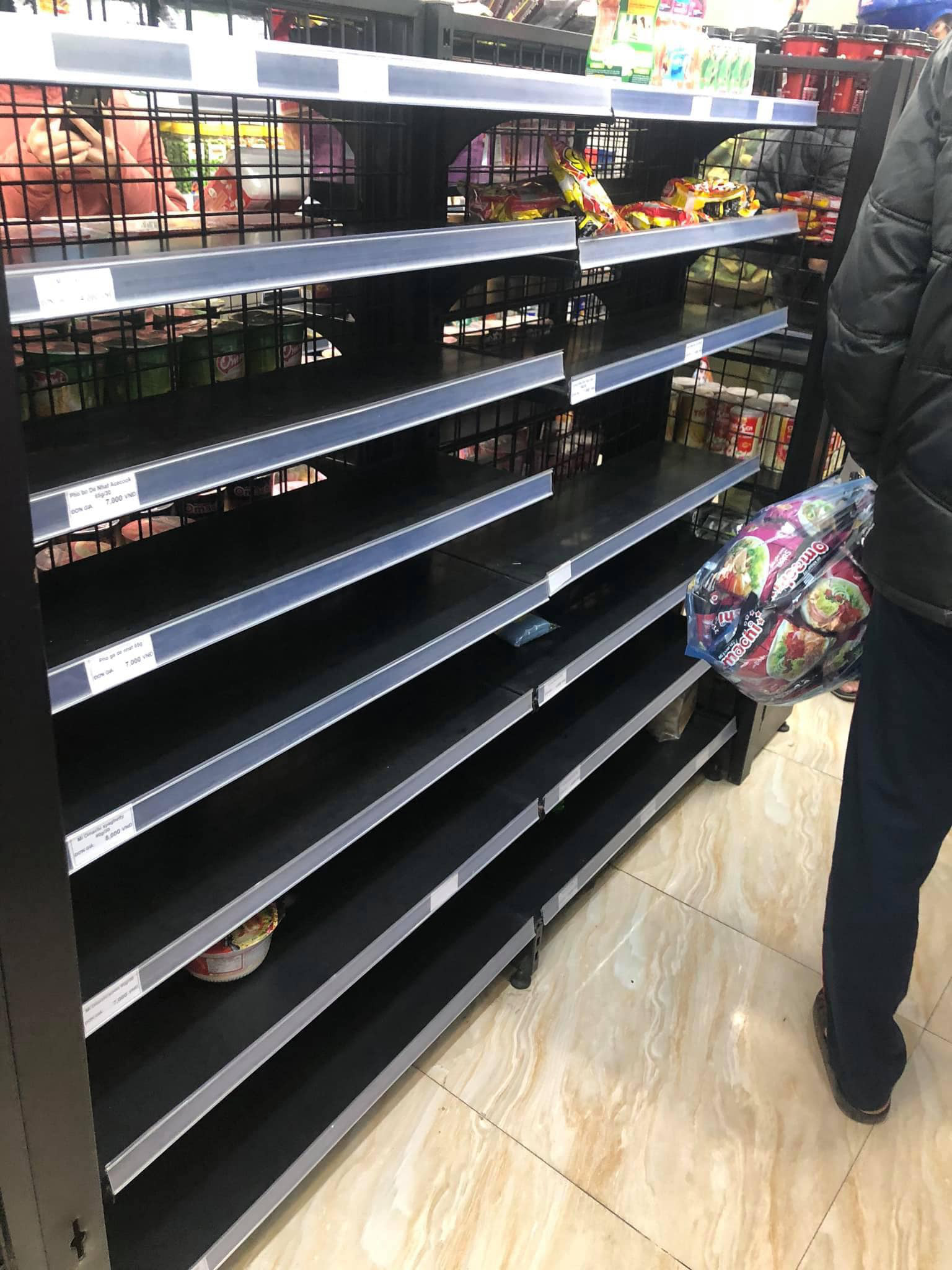 Nhiều người dân kéo nhau đi mua thực phẩm tích trữ ngay trong đêm. Vào khoảng 1h sáng 7/3, kệ mì tôm ở cửa hàng Circle K đều được mua gần hết. Ảnh Pháp luật & Xã hội