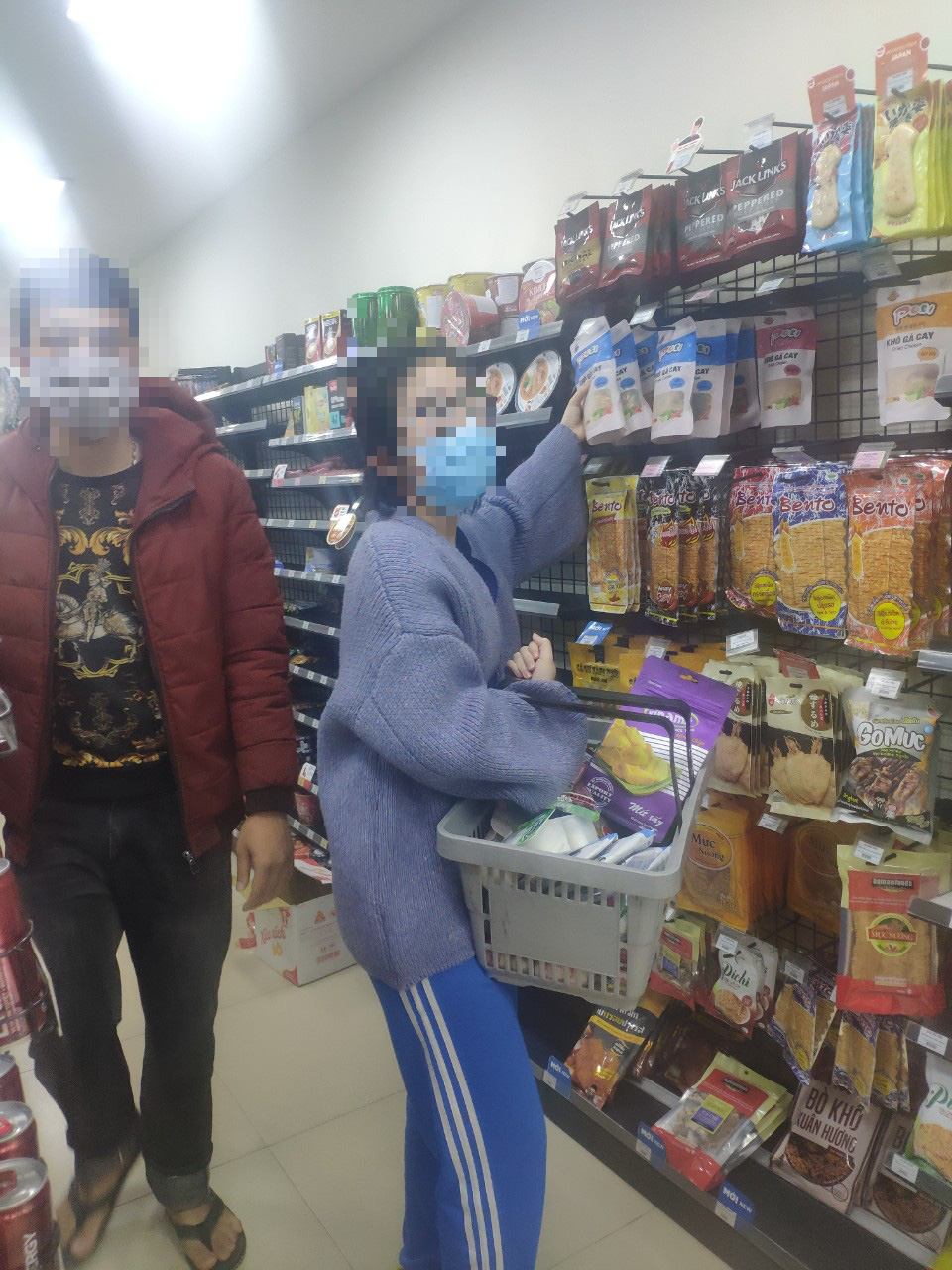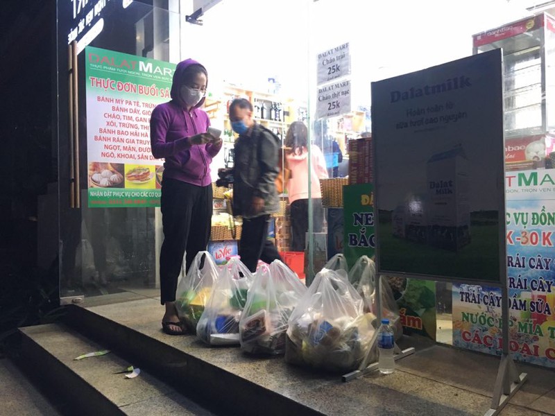 Một người phụ nữ với nhiều túi thực phẩm to nhỏ đặt bên ngoài cửa hàng. Ảnh Báo Pháp Luật