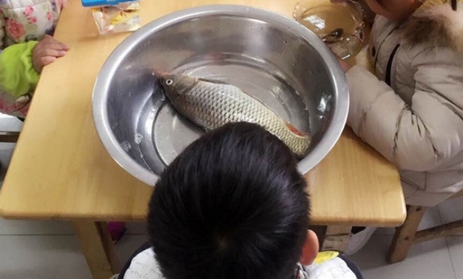 Không biết cậu bé đã truyền đạt như thế nào với bố mẹ mình mà buổi học hôm đó, trong khi tất cả các bạn khác chỉ mang theo một chú cá vàng nhỏ xinh đựng trong một chiếc hộp nhựa be bé, thì cậu bé này lại vác hẳn một chú cá chép đựng trong thau nhôm vào lớp.