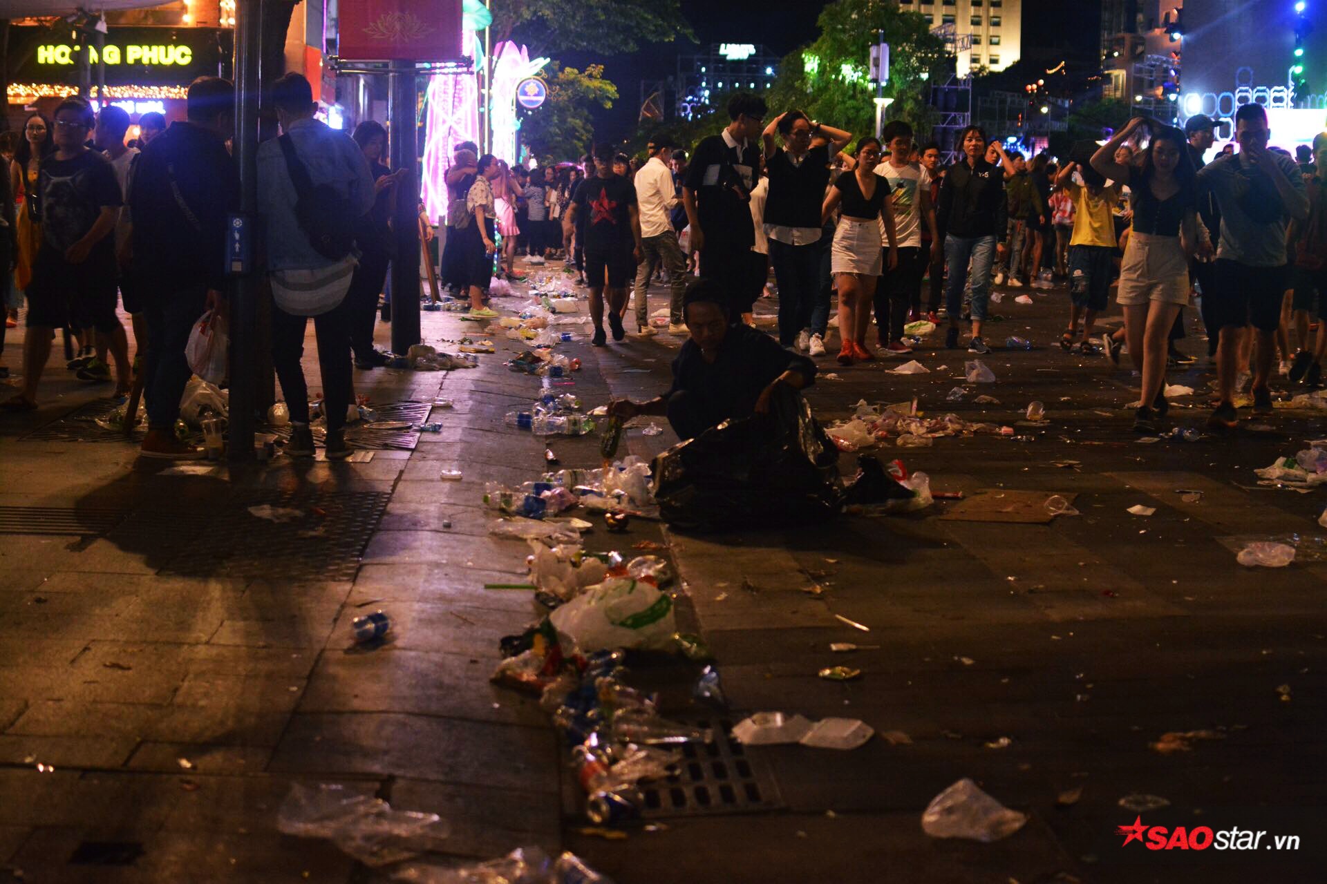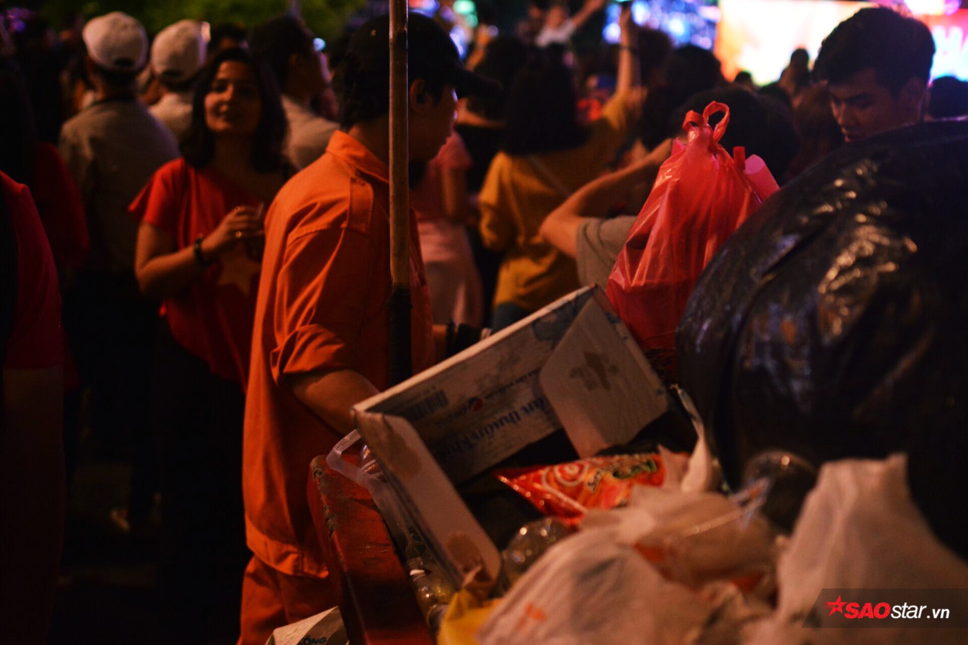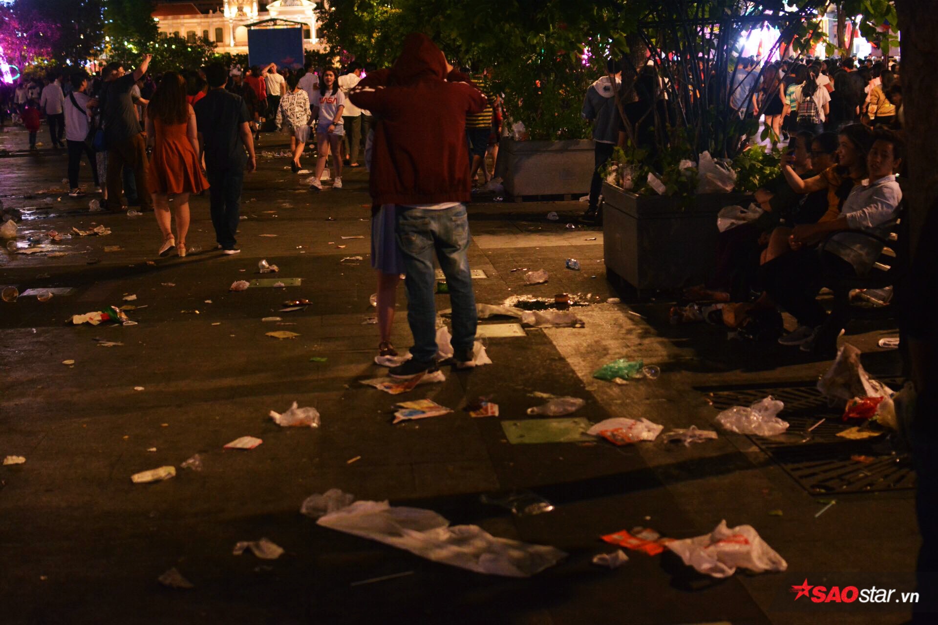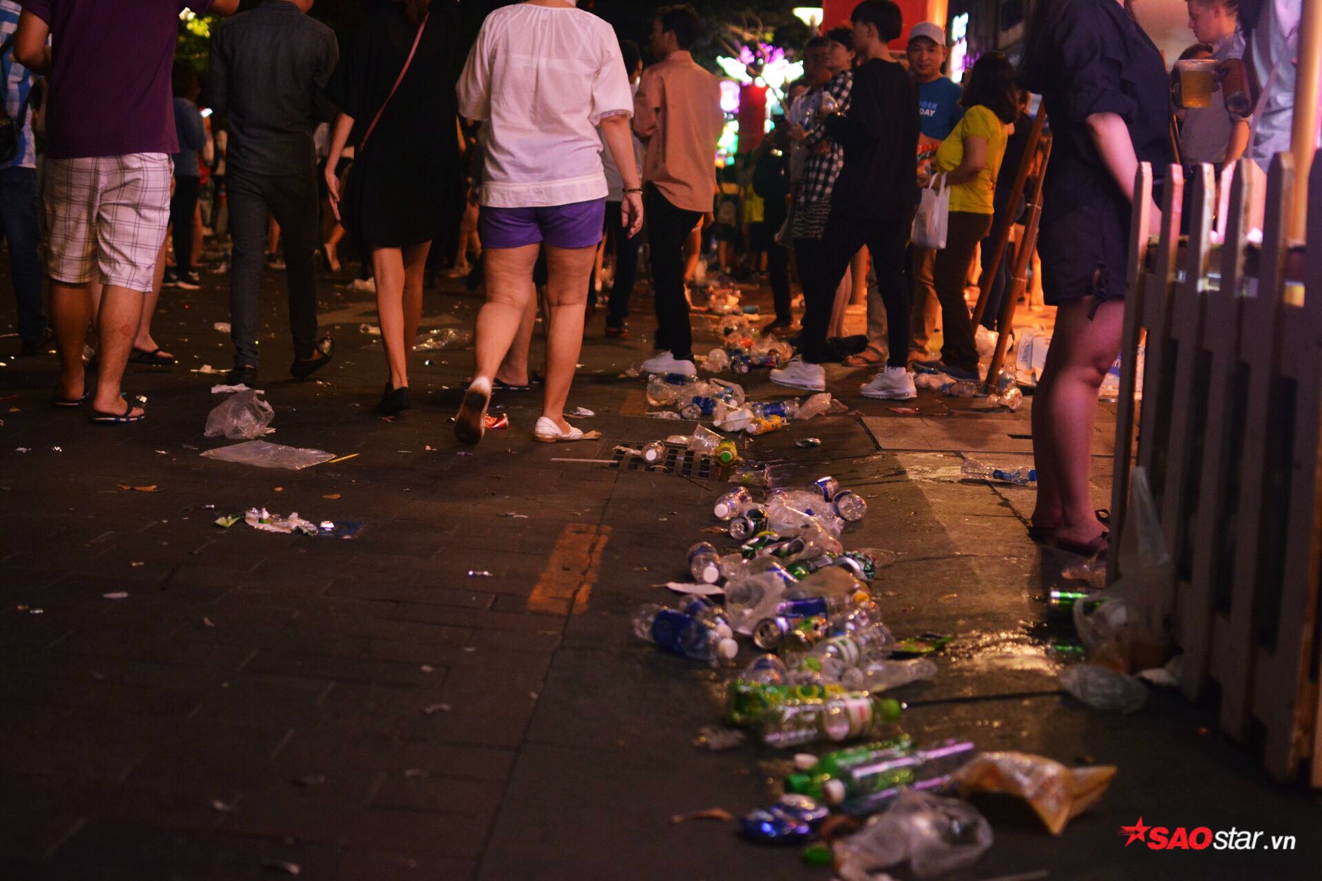 Thế nhưng, sau thời khắc thiêng liêng ấy, nhiều người lại nhanh chóng lũ lượt ra về, để lại phố đi bộ ngập ngụa trong rác thải. Có nhiều gia đình còn mang cả bạt, chiếu trải ra để ngồi ăn uống chờ đón pháo hoa, thế nhưng hết giờ họ cũng bỏ ra về mà chẳng bận tậm dọn dẹp.