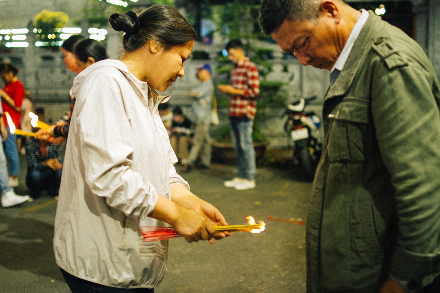 Có mặt tại chùa Vĩnh Nghiêm (Q.3, TP. HCM) dù đã rất khuya song vẫn có hàng nghìn người dân tới thắp hương, khấn vái. Không khí thiêng liêng và giây phút mọi người cùng tĩnh tâm, chắp tay cầu nguyện bằng cả lòng thành cho một năm mới tràn đầy niềm vui, thành công và hy vọng.