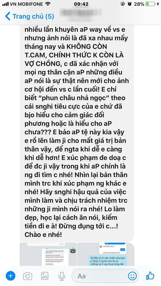 Thế mà chị còn bảo chị không hề “giật chồng” thì xem ra chị thanh cao quá nhỉ. Bây giờ tôi cho 2 người đến với nhau 1 cách công khai, nhưng thà rằng chị đừng phiền đến tôi, đừng buông lời thách thức tôi. Vậy mà chị đã chủ động inbox cho tôi thì tại sao tôi phải tiếp tục im lặng với loại người như chị?”.