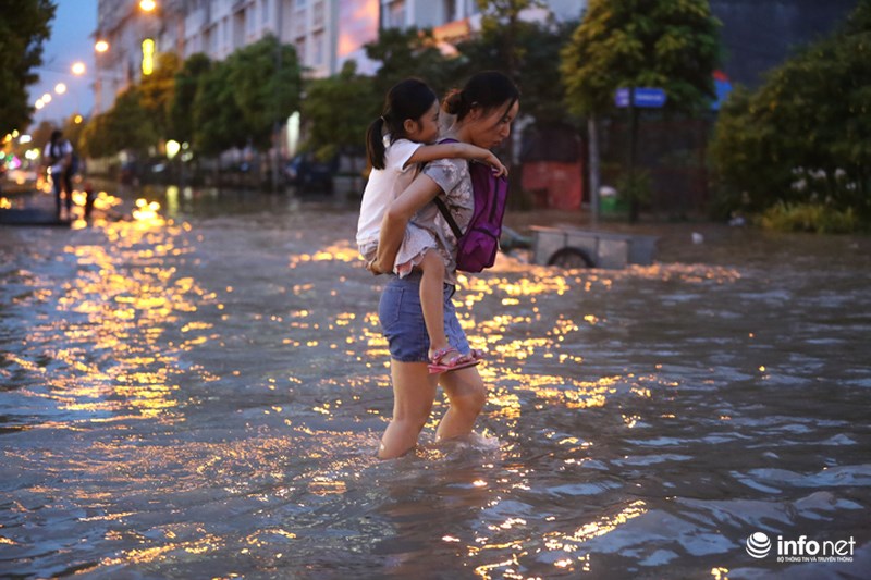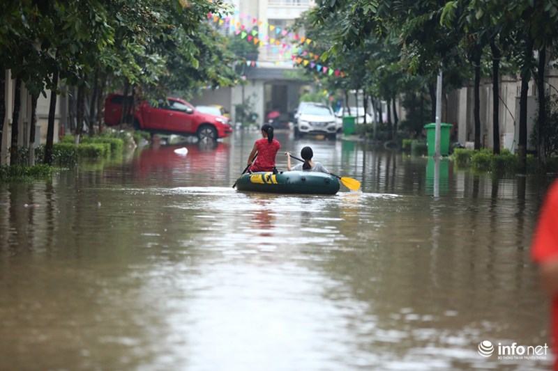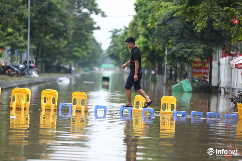 Trận mưa lớn ở Hà Nội sau nhiều ngày nhấn chìm nhiều tuyến phố của Hà Nội vào biển nước. Khu vực thiên đường Bảo Sơn có nhiều đoạn ngập sâu cả mét, người dân phải kê ghế làm cầu phao băng qua nước.