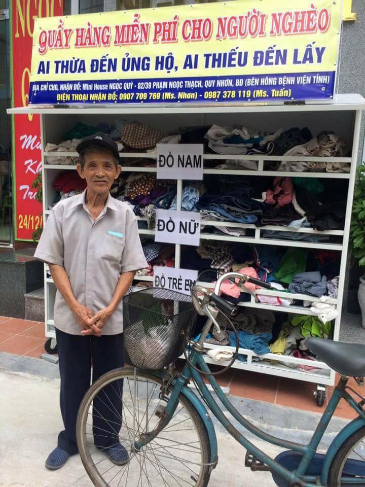 Dáng vẻ khắc khổ với chiếc xe cà tàng, cụ ông tóc đã bạc trắng dù rất muốn được nhận quần áo miễn phí nhưng vì sợ mình không được nên đã phải quay về nhà lấy sổ hộ nghèo để chứng minh cho người khác biết mình có thể lấy quần áo ở đây. Câu chuyện được kể lại ở một địa điểm được đặt tủ quần áo miễn phí tại thành phố Quy Nhơn, tỉnh Bình Định.