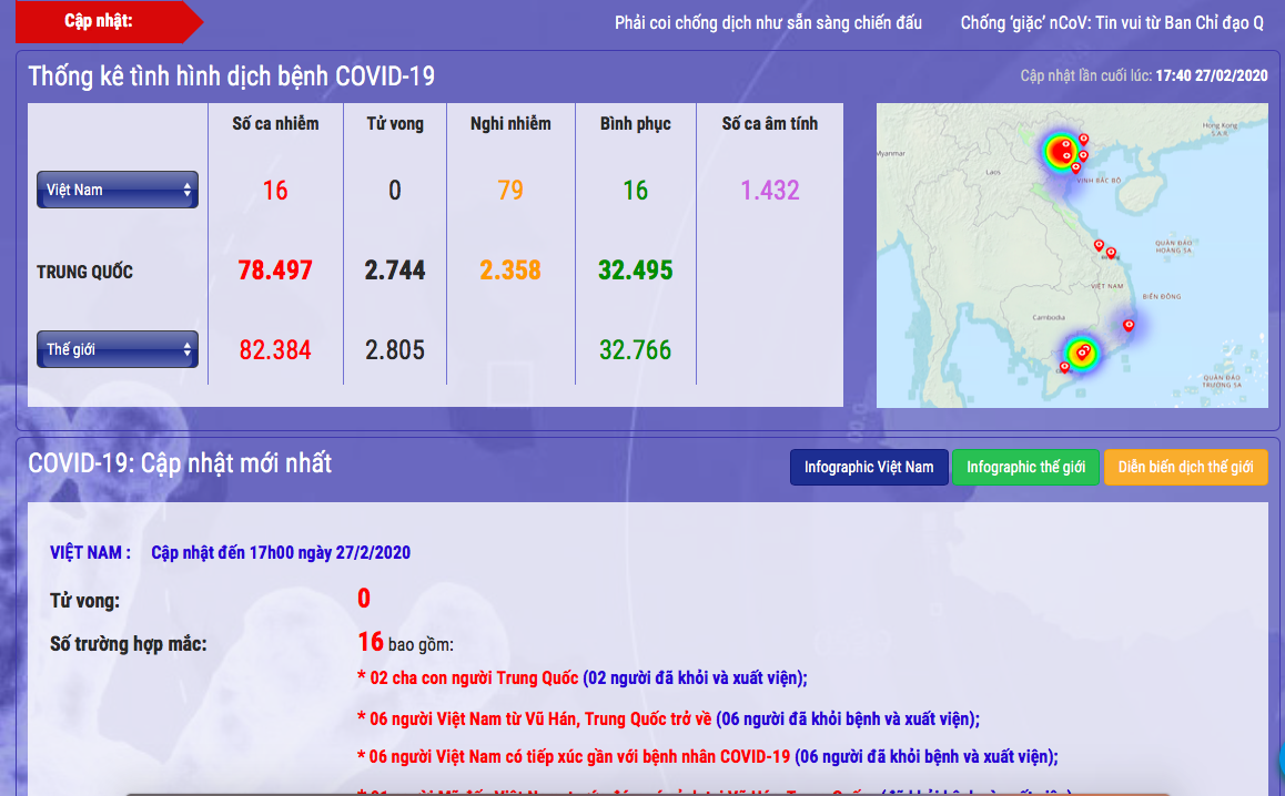 Theo thông tin từ Hệ thống giám sát dịch bệnh của Việt Nam, tính đến 17h giờ ngày 27/02/2020, thế giới đã ghi nhận 82.384 trường hợp mắc bệnh viêm đường hô hấp cấp COVID-19 tại 50 quốc gia và vùng lãnh thổ, trong đó có 2.805 trường hợp tử vong (Trung Quốc: 2.744, Iran: 19, Hàn Quốc: 13, Ý: 12, Tàu Diamond Princess: 04, Nhật Bản: 03, Hồng Kông (TQ): 02, Pháp: 02, Đài Loan (TQ): 01, Philippin: 01).