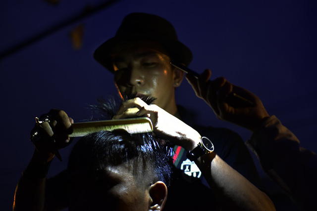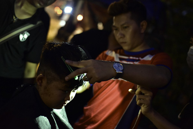 Hình ảnh khá lạ khi những anh thợ hớt tóc trên vỉa hè bằng đèn flash điện thoại