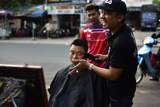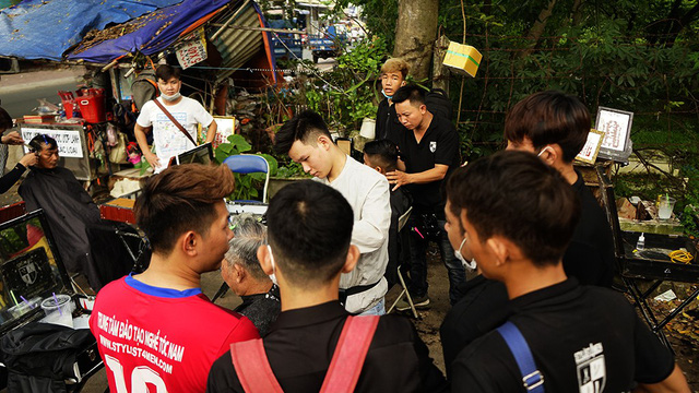 Hình ảnh đặc trưng của điểm hớt tóc trên vỉa hè này là một khách được khá nhiều thợ chăm sóc