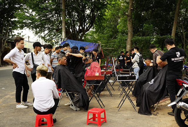 Hỏi ra mới biết đây là lớp dạy cắt tóc của một cơ sở dạy nghề cho học viên. Thay vì ngồi ở tiệm chờ khách đến hớt, lớp học này hướng học viên ra vỉa hè cắt tóc miễn phí cho người lao động hay những ai có nhu cầu.