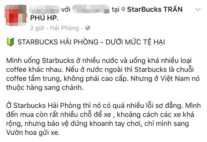 “Mình uống Starbucks ở nhiều nước và uống khá nhiều loại coffee khác nhau. Nếu ở nước ngoài thì Starbucks là chuỗi coffee tầm trung, không phải cao cấp. Nhưng ở Việt Nam nó thuộc hàng sang chảnh. Ở Starbucks Hải Phòng thì nó có quá nhiều lỗi sơ đẳng. Mình đến mua còn rất nhiều chỗ để xe khá rộng, nhưng bảo vệ đứng khoanh tay chơi, chỉ mình sang vườn hoa gửi xe.
