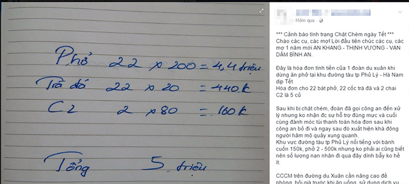 Theo như hình ảnh, nhóm người này vào một quán phở tại khu đường tàu thành phố Phủ Lý, tỉnh Hà Nam. Sau khi thanh toán mới “ngã ngửa” với giá trên trời của những món bình dân này. 200 nghìn một bát phở, 20 nghìn một ly trà đá, 80 nghìn một chai nước ngọt. Tổng hóa đơn thanh toán cho 22 tô phở, 22 ly trà và 2 chai nước ngọt là 5 triệu đồng.