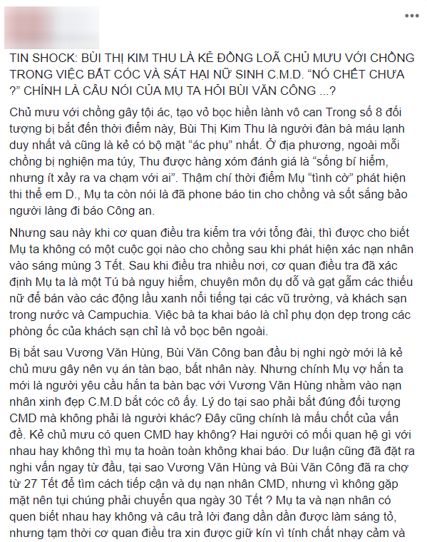 Bài đăng này đề cập đến rất nhiều chi tiết của vụ án, trong đó nổi bật lên chi tiết Bùi Kim Thu (SN 1975), vợ kẻ chủ mưu Bùi Văn Công là một tú bà chuyên nghiệp. “Mụ ta là một Tú bà nguy hiểm, chuyên môn dụ dỗ và gạ gẫm các thiếu nữ để bán vào các động lầu xanh nổi tiếng tại các vũ trường, và khách sạn trong nước và Campuchia. Việc bà ta khai báo là chỉ phụ dọn dẹp trong các phòng ốc của khách sạn chỉ là vỏ bọc bên ngoài”, trích nguyên văn một phần bài đăng của tài khoản có tên N.A.L.