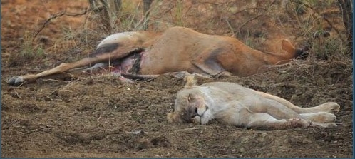 Sau một hồi kiểm tra và biết rằng chú hươu chẳng còn sống, con sư tử liền cẩn thận đưa xác hươu con giấu sâu trong bụi rậm. Tiếp đến, nó đứng canh gần đó một lúc lâu.