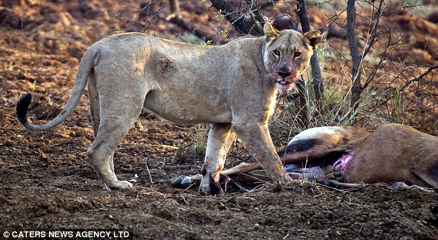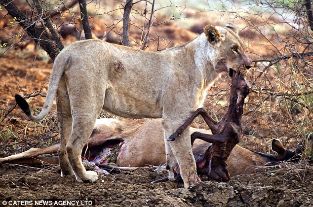 “Chúng tôi đã quan sát thật kỹ cách mà con sư tử cái đặt chú hươu nhỏ vào sâu trong bụi rậm. Nó huých huých chú hươu vài lần, sau đó, nhìn ngó xung quanh như thể cầu mong sự giúp đỡ”.