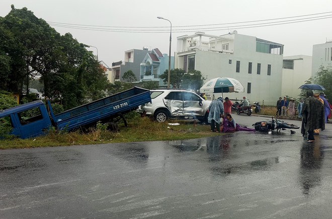 Sau cú tông trực diện, ô tô Fortuner xoay vòng rồi va chạm với xe máy mang BKS 92F2 - 2189 do ông Phạm H. (60 tuổi, ở khối phố Đoan Trai, phường Tân Thạnh) điều khiển đi phía sau xe Fortuner. Trên xe máy chở theo 2 người con trai sinh đôi là Phạm Phú Q. và Phạm Cao S. (cùng học lớp 7, trường THCS Nguyễn Du, TP. Tam Kỳ).