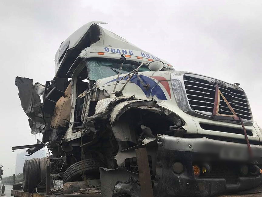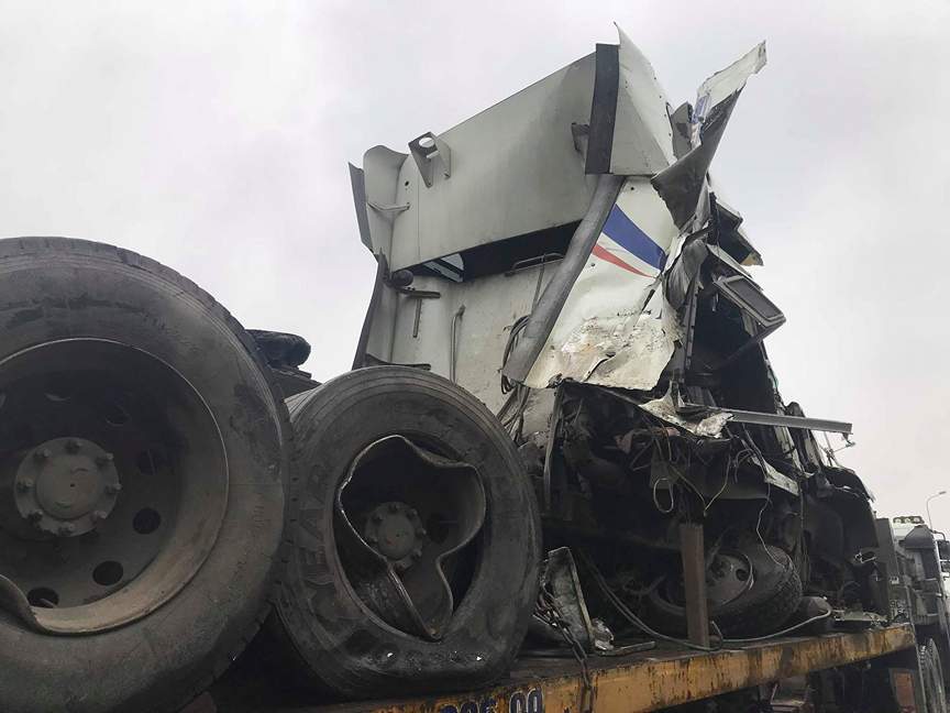 Đầu xe container nát bét sau vụ va chạm liên hoàn.