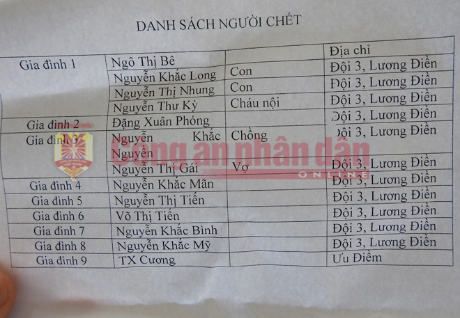 Danh sách 13 người tử nạn. Ảnh: CAND