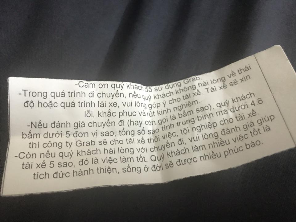 Không chỉ có ở Grab, mẩu giấy xin sao còn xuất hiện trên xe chạy dịch vụ Uber.