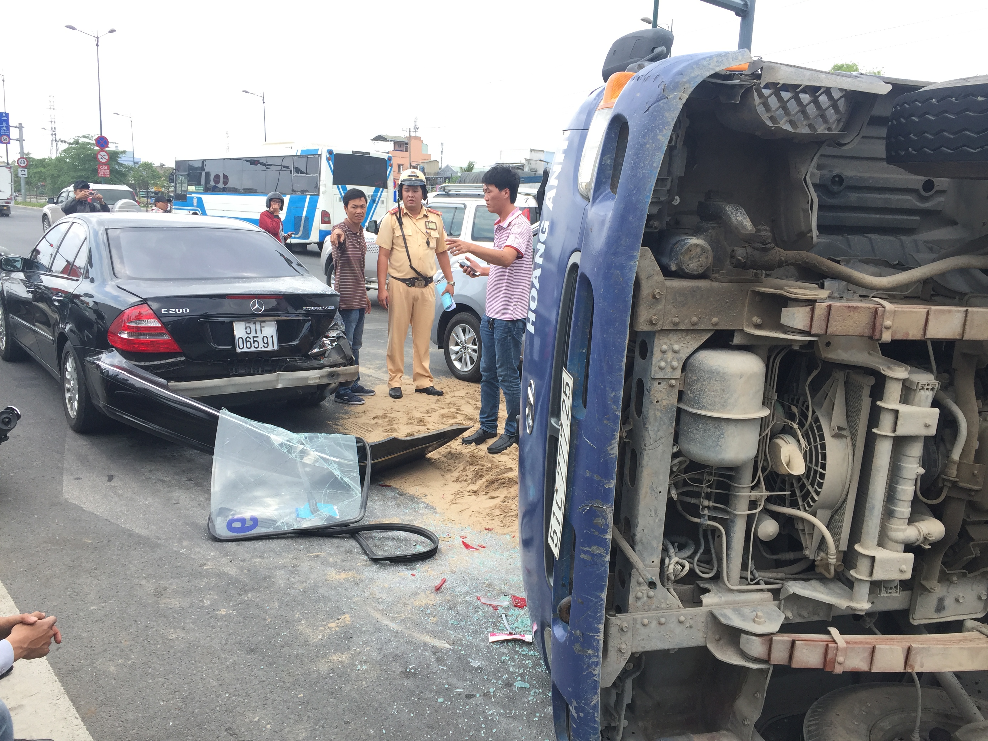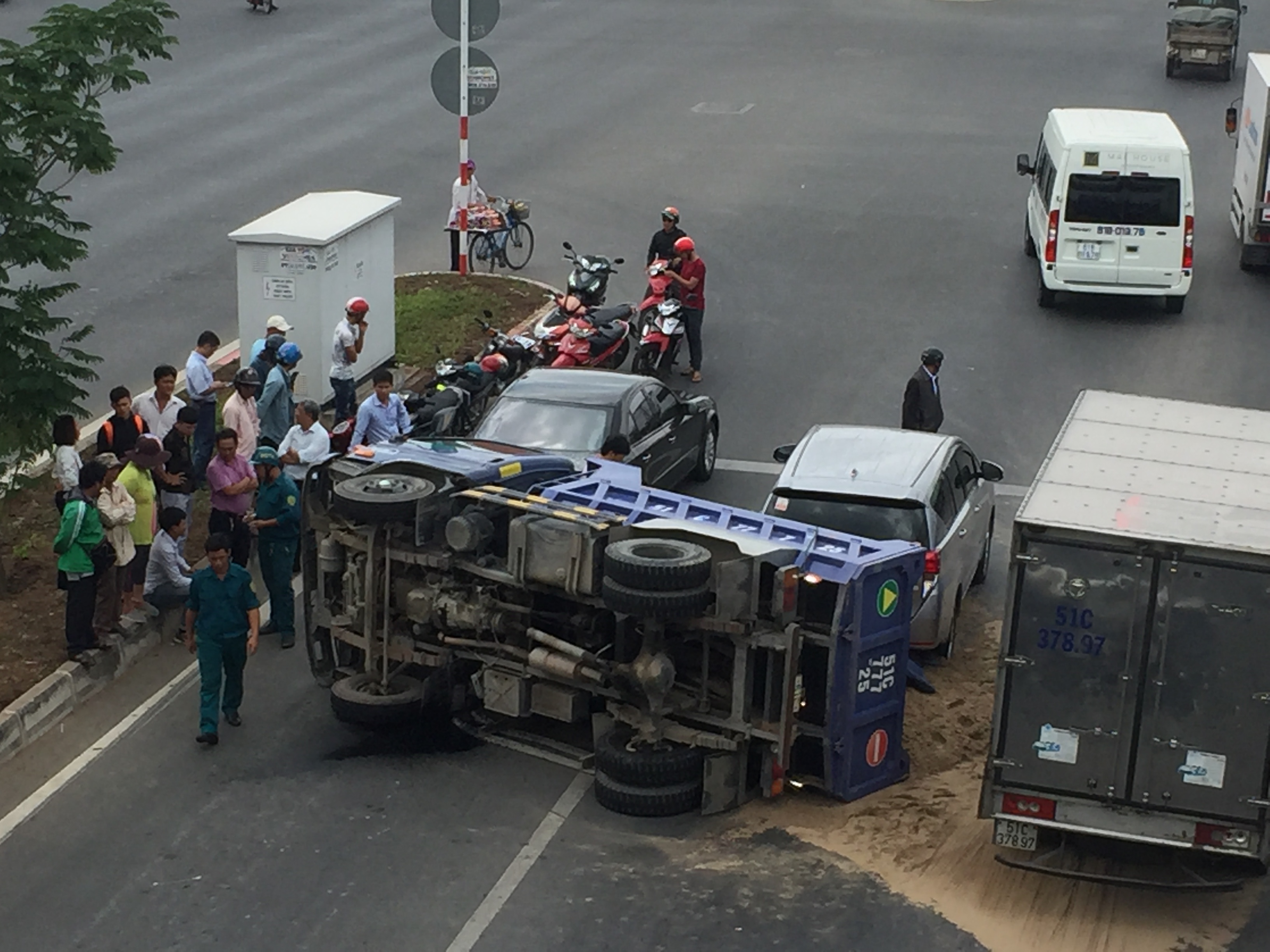 Khi vừa tới ngay ngã 4 Cá sấu Hoa Cà, phường Hiệp Bình Chánh, quận Thủ Đức, tài xế bất ngờ không kiểm soát được tay lái làm xe tải lật ngang trên đường. Chưa dừng lại ở đó, chiếc xe còn trượt dài rồi tông vào đuôi xe ô tô 4 chỗ hiệu Mercedes mang BKS 51F 065.91 và ô tô 7 chỗ mang BKS 51G 021.61 đang dừng chờ đèn tín hiệu, tài xế văng ra khỏi cabin kêu cứu.