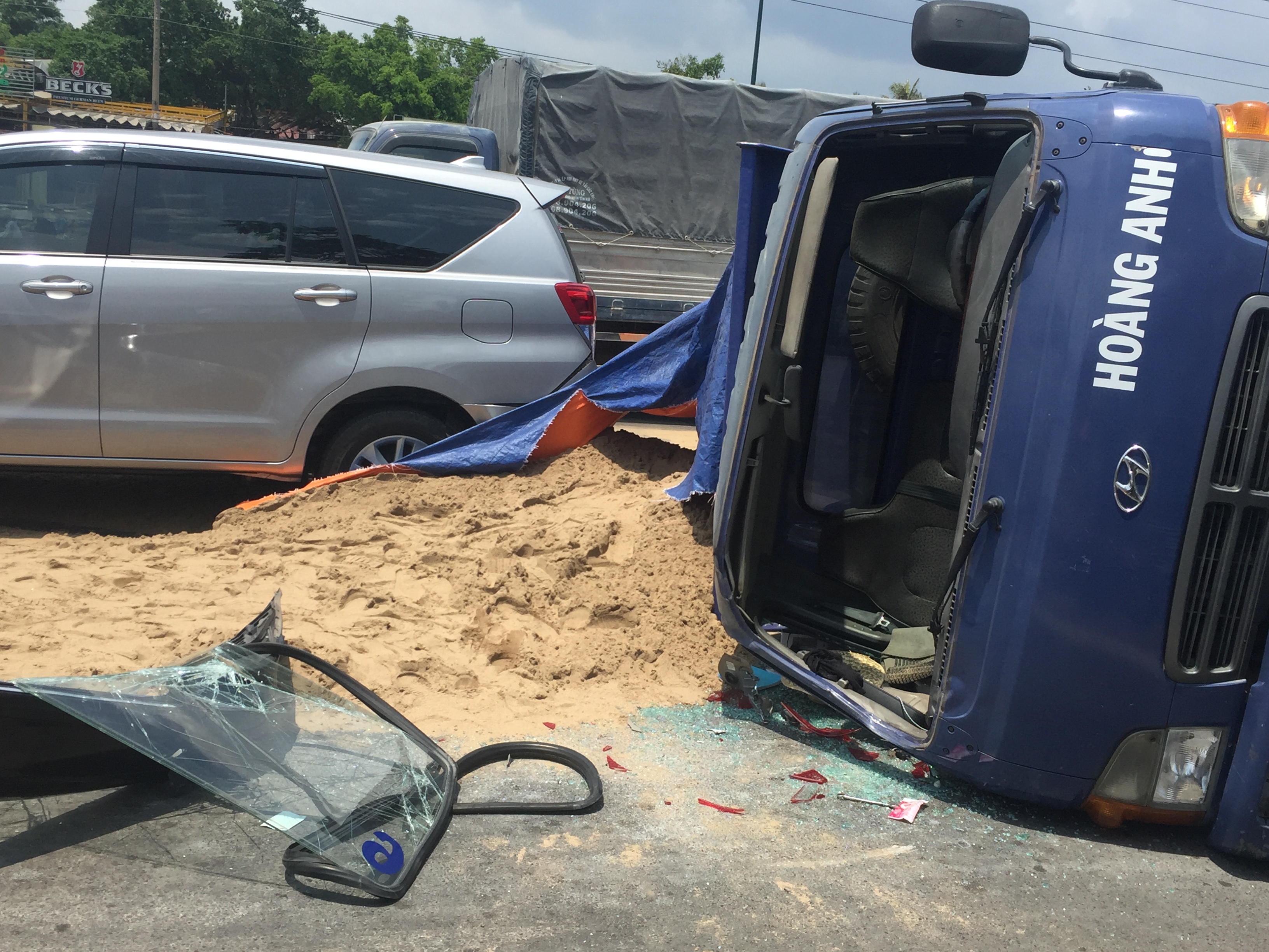 Hiện trường, xe tải lật ngang trên đường, cát trên xe đổ ra đường, dầu nhớt chảy lênh láng, kính chắn gió bể nát. Đuôi xe 2 xe ô tô bị hư hỏng, vụ việc còn khiến giao thông qua khu vực ùn ứ kéo dài.