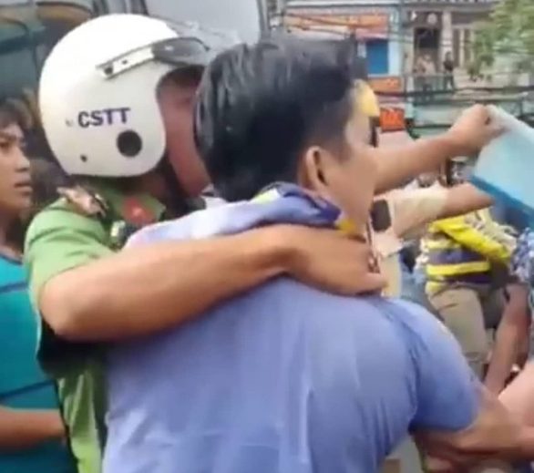 Công an đến hiện trường giải quyết vụ xô xát giữa tài xế buýt và người chạy Grab. (Ảnh: Báo Tuổi Trẻ).