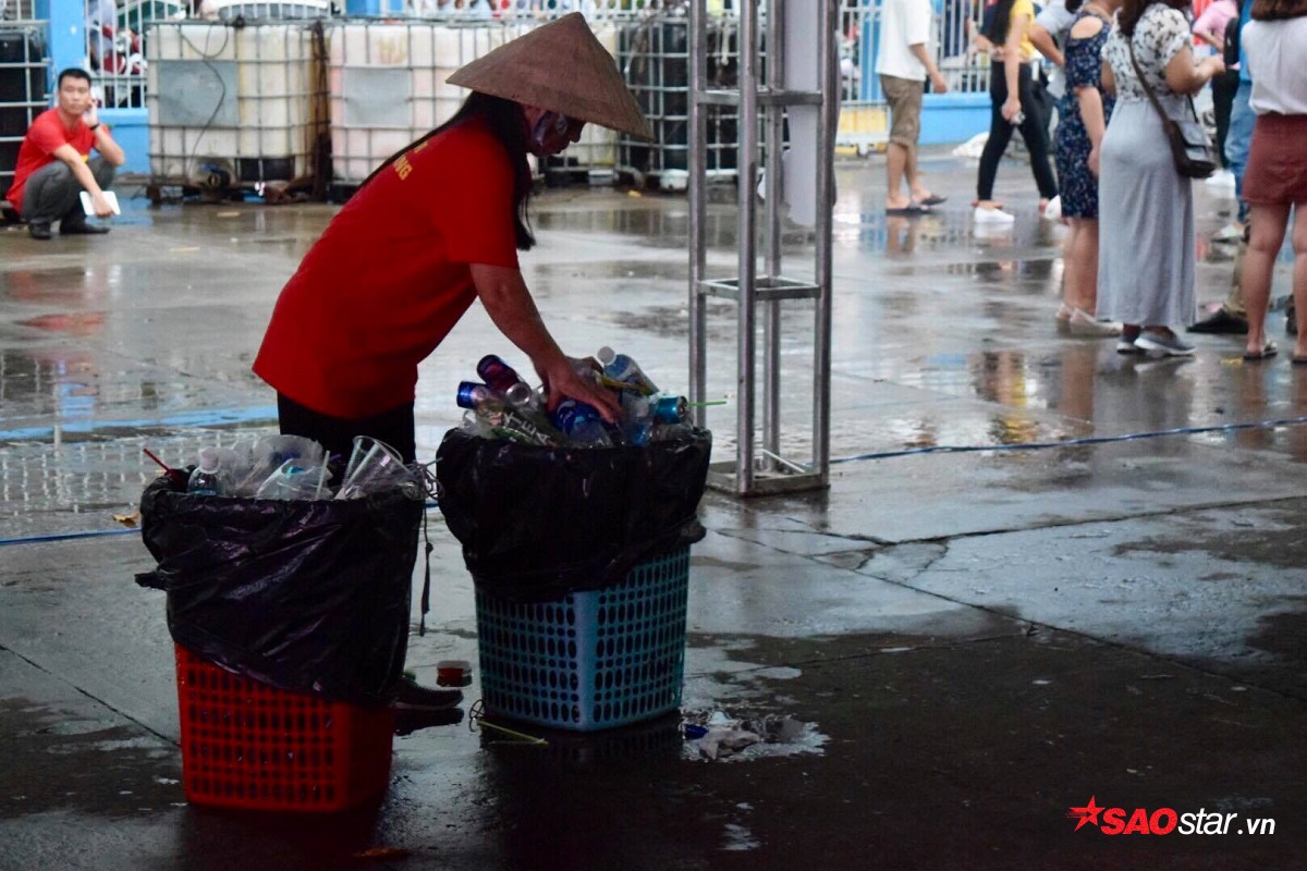 2 cổ động viên tích cực gom rác bất chấp trời mưa.