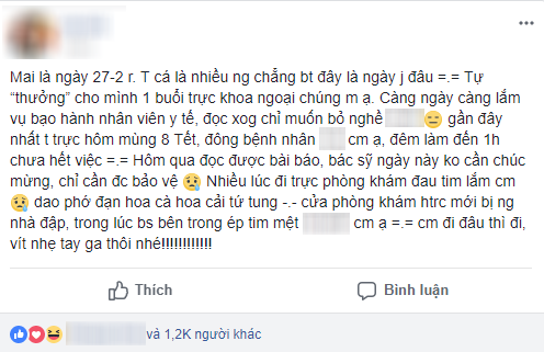 Chủ nhân bài viết tâm sự: “Mình cá là nhiều người không biết ngày 27/2 là ngày gì đâu. Nay, tự thưởng cho mình 1 buổi trực khoa Ngoại. Càng ngày càng lắm vụ bạo hành nhân viên y tế, đọc xong chỉ muốn bỏ nghề. Gần đây nhất, mình trực hôm mùng 8 Tết, đông bệnh nhân, đêm làm đến 1h vẫn chưa hết việc.