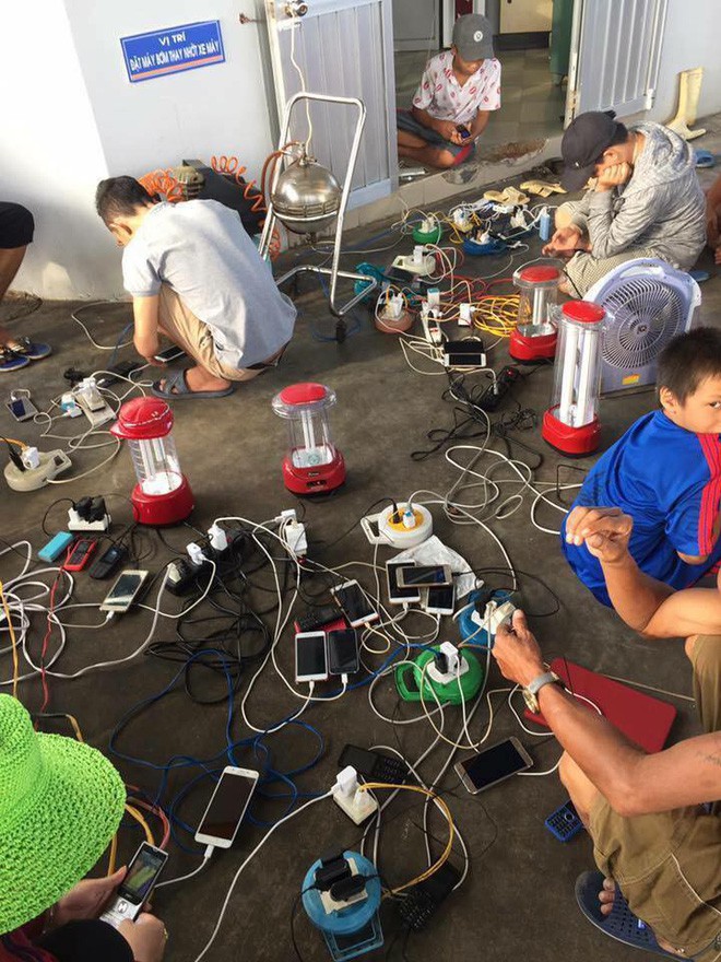 Tất cả các ổ cắm điện được huy động sao cho sạc càng được nhiều điện thoại càng tốt. Nguồn ảnh: Facebook.