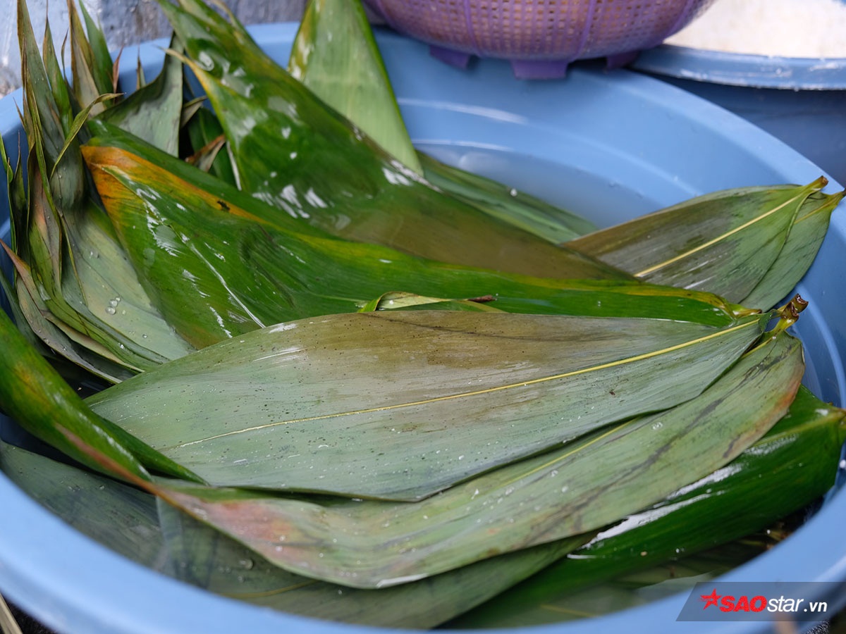 Bán ú được gói trong lá tre để sạch và tạo thẩm mỹ, mỗi cái bánh cần 3 lá tre bản to.
