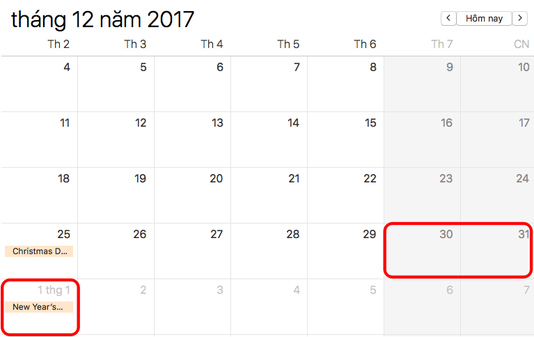 Ngày 1 Tết dương lịch năm nay rơi vào thứ 2 đầu tuần. Ngày 30/12/2017 và 31/12/2017 rơi vào 2 ngày thứ 7 và Chủ nhật. Do đó, Dịp nghỉ Tết Dương lịch năm 2018 sẽ kéo dài 3 ngày.