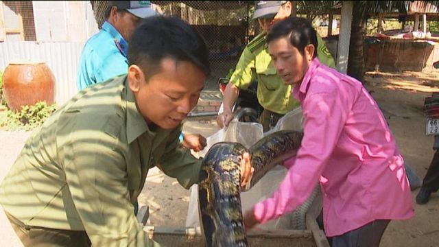 Lực lượng chức năng chuẩn bị đưa con trăn về môi trường tự nhiên