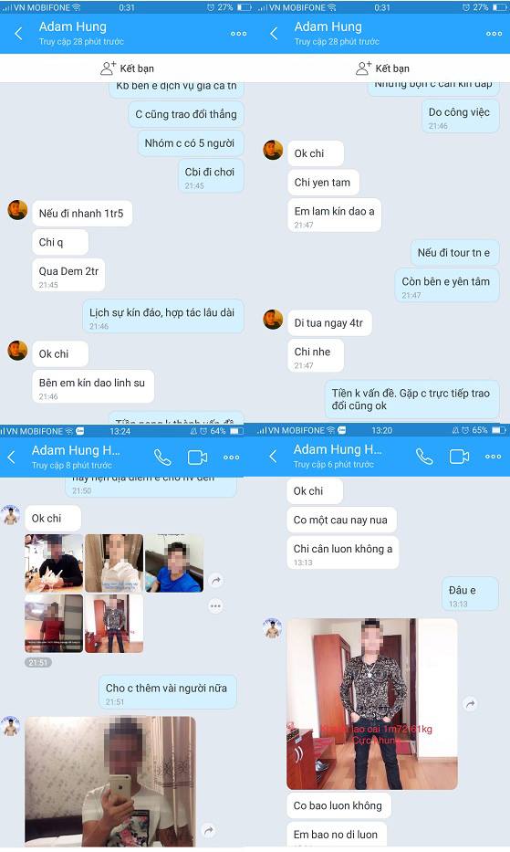 Theo đó, Th giới thiệu mình sinh năm 1987, quê ở Nghệ An và là quản lý đường dây mại dâm nam trên khắp 3 miền đất nước. Bất kỳ khách ở tỉnh thành nào, Th đều cố gắng “chiều” khách đến cùng. Chính vì thế, đường dây “trai bao” của Th không chỉ có tiếng là quy tụ dàn “mỹ nam” chất lượng mà còn thể hiện độ chuyên nghiệp trong cách “phục vụ” các “thượng đế”. Khi có khách hàng liên hệ, Th sẽ điều phối, sắp xếp và cử nhân viên đi phục vụ khách.