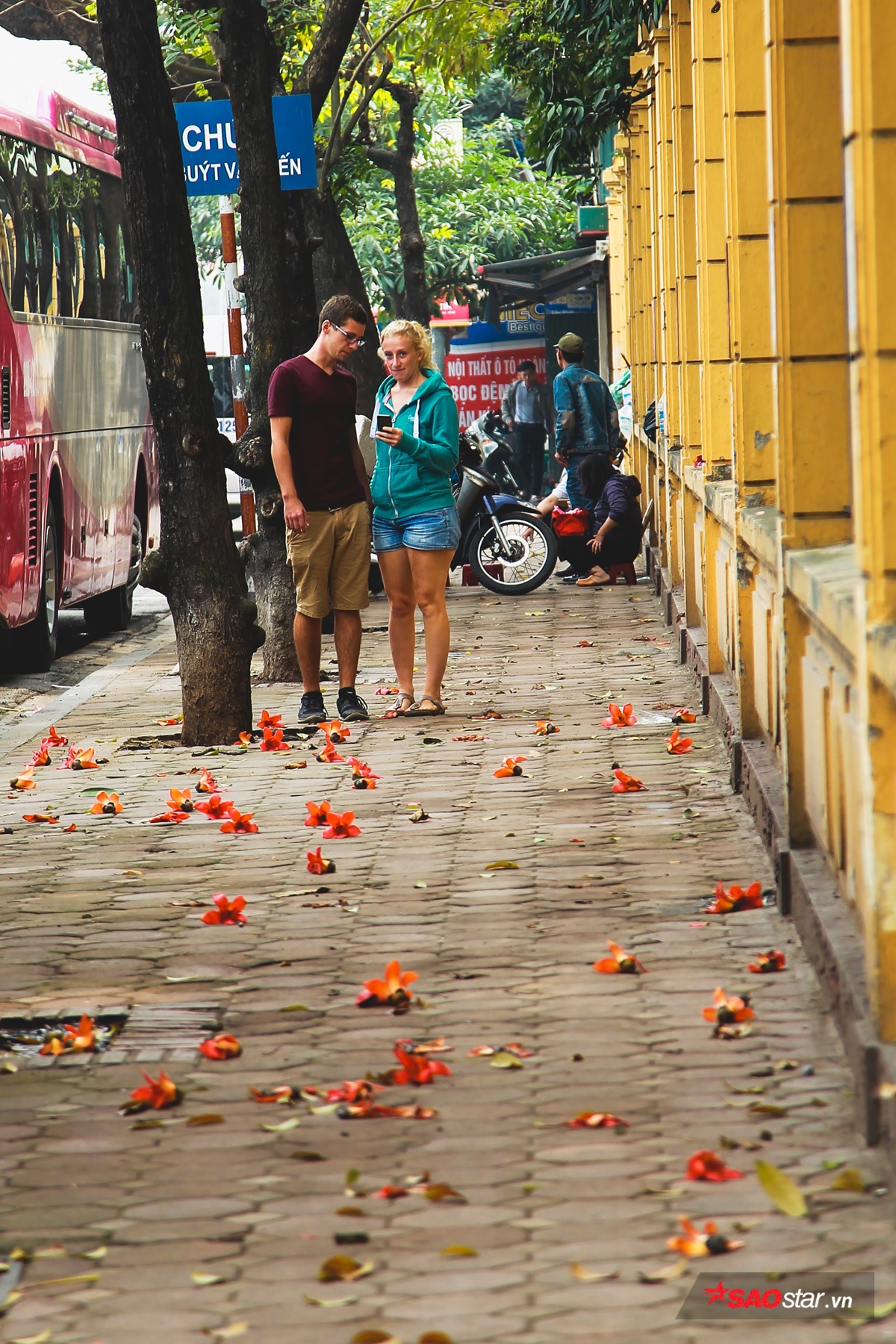 Xác hoa gạo rụng đầy lối đi khiến nhiều du khách đi qua thích thú dừng lại chụp ảnh.