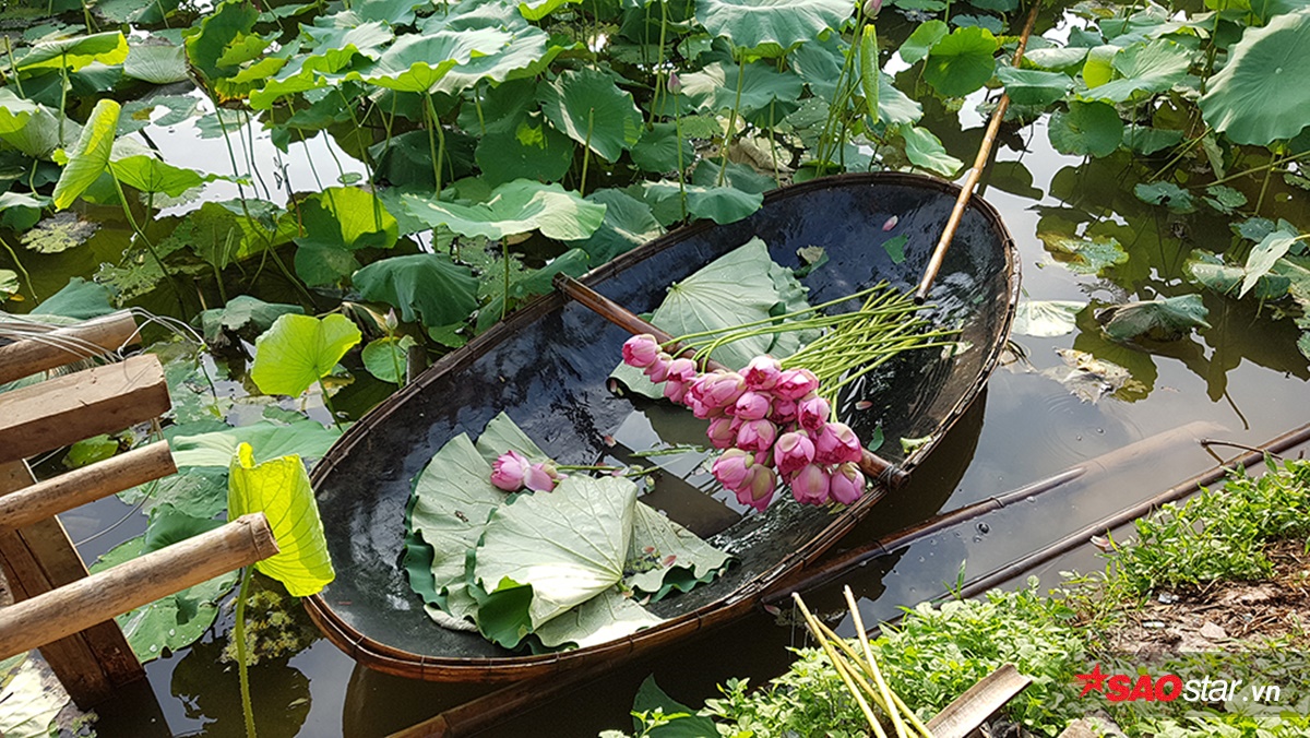 Chiếc thuyền thúng đầy hoa sen để du khách có nơi tạo dáng chụp ảnh.