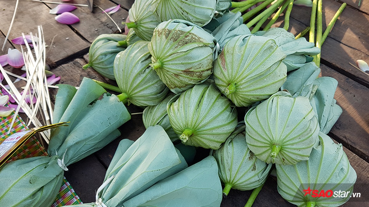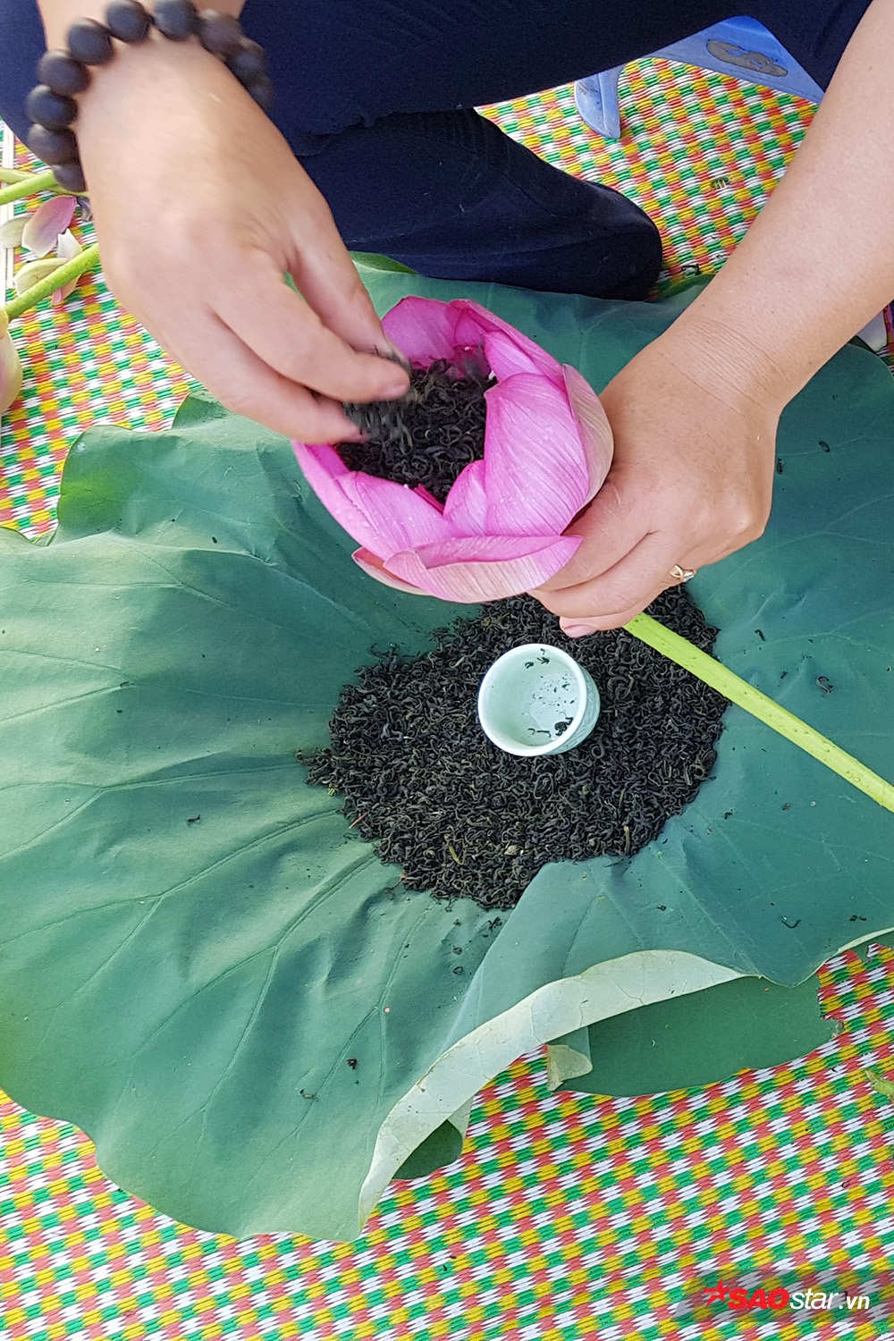 Trà được đổ vào trong bông sen, rồi lấy lá sen buộc túm vào, sau đó sẽ được ướp hương ngay trên hồ sen trong suốt một ngày để hôm sau có thể ra lấy búp sen chứa đầy trà để thưởng thức.