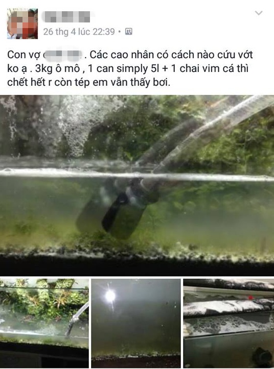 Tài khoản H.P.V mới đây đăng tải lên mạng xã hội những hình ảnh về bể cá thuỷ sinh yêu quý của mình kèm lời kêu cứu cho những con cá khiến dân mạng vừa buồn cười vừa thương. Bởi vì trước đó, vợ anh đã thẳng tay đổ đổ 3kg bột giặt, 5 lít dầu ăn, 1 chai nước tẩy bồn cầu vào bể cá thủy sinh mà anh rất mất công chăm dưỡng.