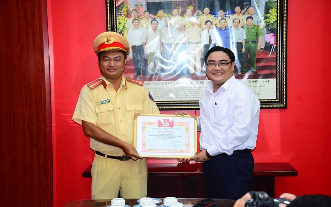 Ông Ngô Minh Hải (Phó Bí thư Thành Đoàn) trao bằng khen cho 2 chiến sĩ đội CSGT An Sương.