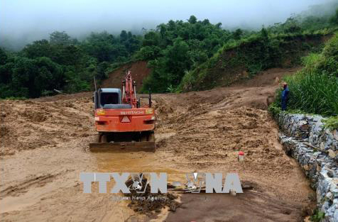 Máy múc được huy động tới điểm sạt lở nặng tại bản Pù Toong, xã Pù Nhi, huyện Mường Lát. Ảnh: TTXVN.