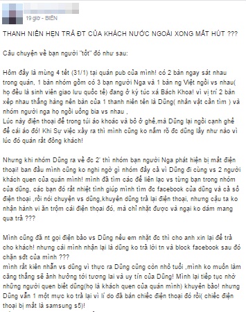 “Câu chuyện về bạn người 'tốt' đó như sau: Hôm đấy là mùng 4 Tết (31/1) tại quán pub của mình! Có 2 bàn ngay sát nhau trong quán, 1 bàn nhóm gồm có 3 bạn người Nga và 1 bàn người Việt ngồi với nhau (họ đều là sinh viên giao lưu quốc tế) đang ở ký túc xá Bách Khoa! Vì vị trí 2 bàn xếp nhau thẳng hàng nên bàn của 1 thanh niên tên là Dũng (nhân vật cần tìm) và nhóm người Nga họ ngồi uống bia với nhau. Lúc này điện thoại để trong túi áo khoác và bỏ ở ghế, mà Dũng lại ngồi cạnh ghế để cái áo đó! Khi sự việc xảy ra thì mình cũng không nắm rõ được Dũng lấy như nào vì lúc đó quán rất đông khách!