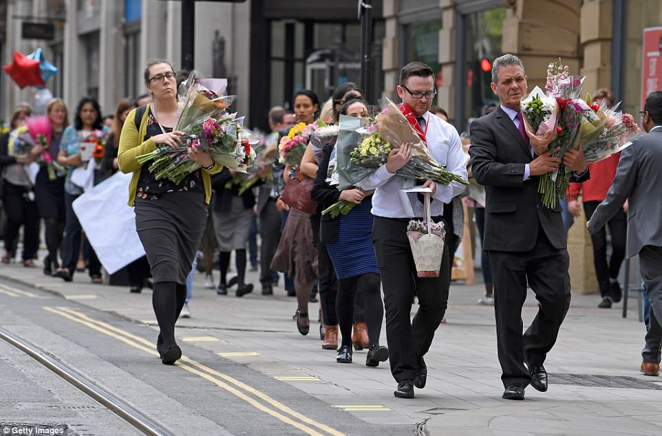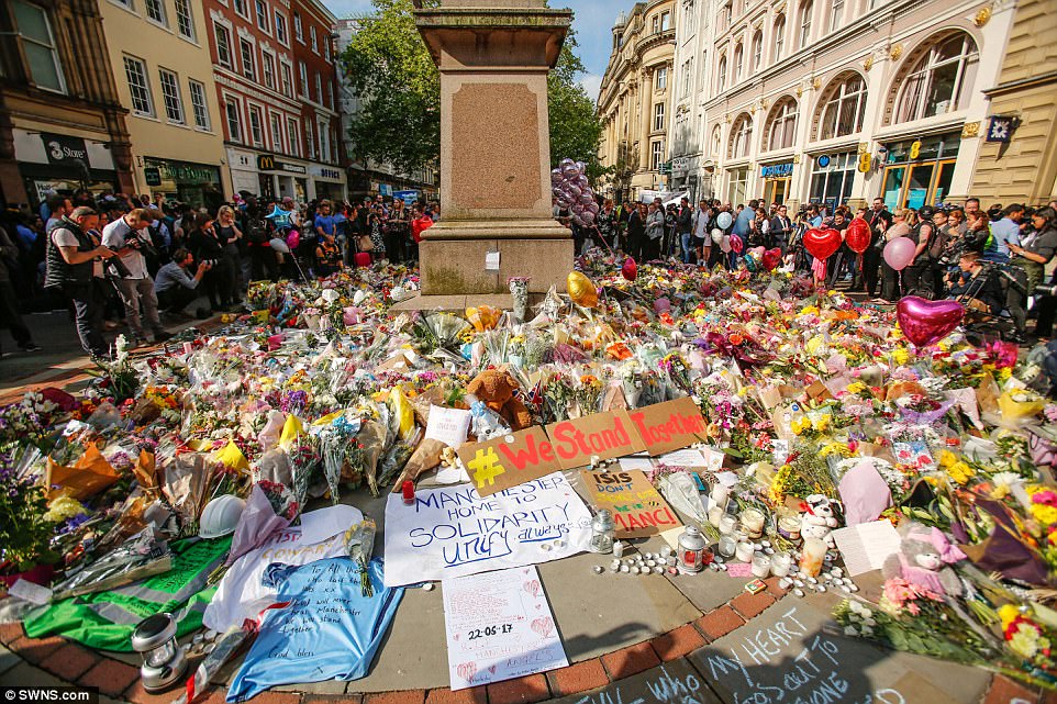 Hoa tưởng niệm được đặt quanh quảng trường St.Ann cùng nhiều khẩu hiệu mạnh mẽ của người dân Manchester cho thấy họ đang sẵn sàng đấu tranh chống lại sự tàn bạo của các nhóm khủng bố.