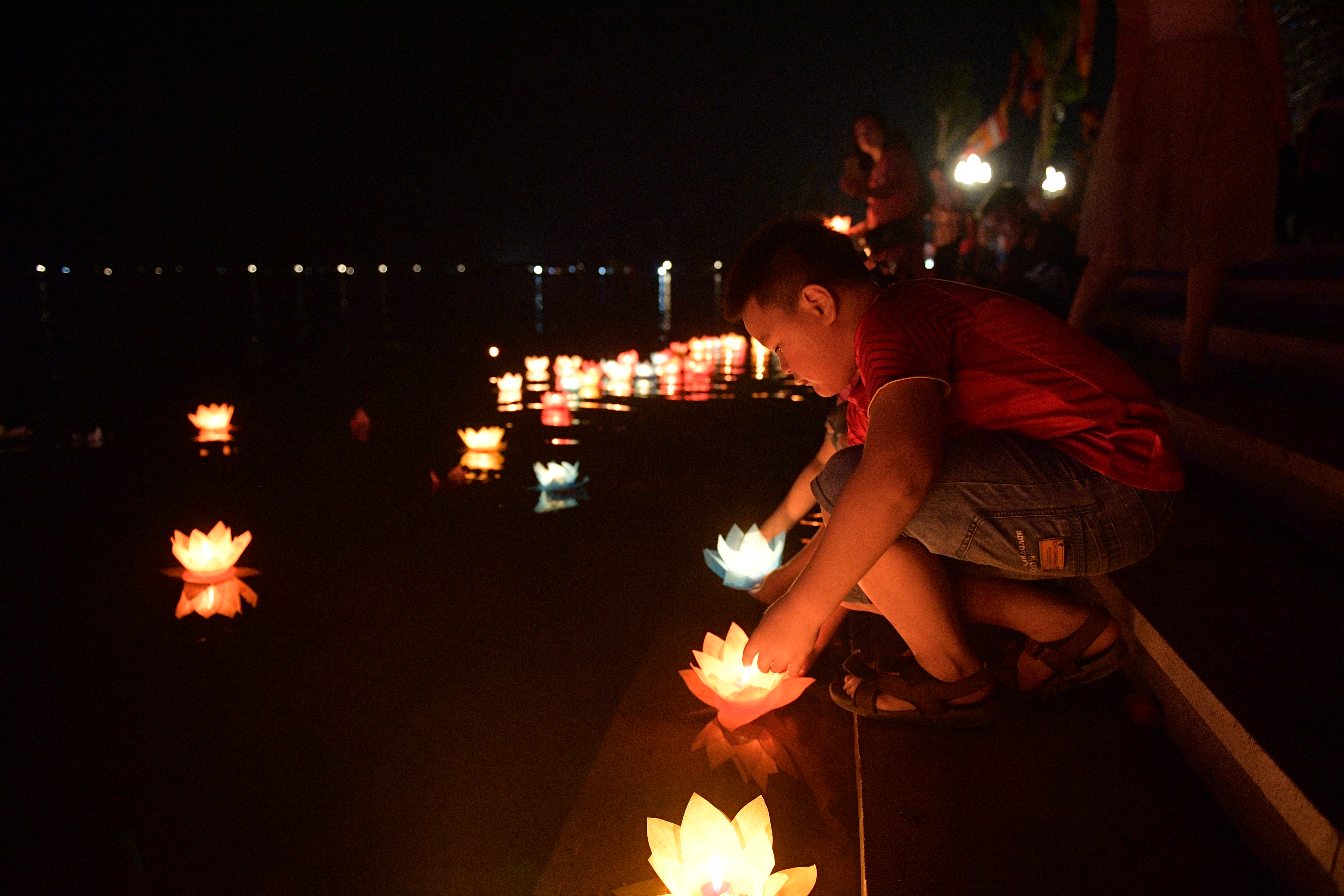 Những ngọn đèn hoa đăng được thả lên mặt hồ.