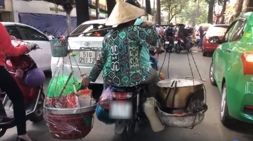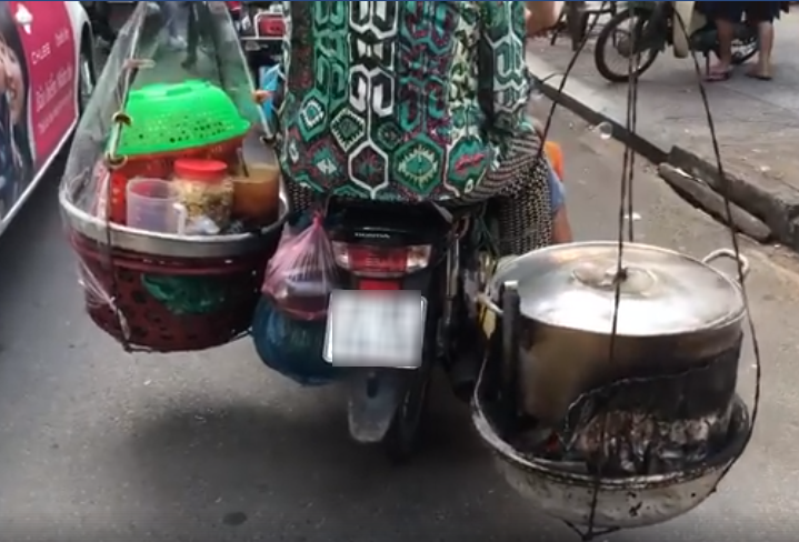 Theo những gì clip ghi lại, bếp than đỏ rực, nồi nước dùng sôi sùng sục và nghi ngút khói trên quang gánh người phụ nữ được 1 người đàn ông chở bằng xe máy chạy trên tuyến đường tấp nập xe cộ vào giờ cao điểm buổi sáng. Những phương tiện giao thông trong clip đều rất cẩn trọng khi đi bên cạnh, thậm chí nhiều người vội vàng vượt qua hoặc lùi về phía sau để tránh tai họa đang rình rập.