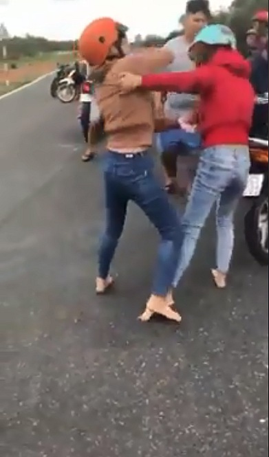 Theo những gì đoạn clip ghi lại, hai cô gái còn khá trẻ, một người mặc áo đỏ, một người áo da, cả hai trên đầu đội mũ bảo hiểm lớn tiếng chửi bới rồi lao vào đánh nhau. Cả hai liên tục đánh vào mặt, vào đầu và giật tóc đối phương trước sự chứng kiến của nhiều người xung quanh.
